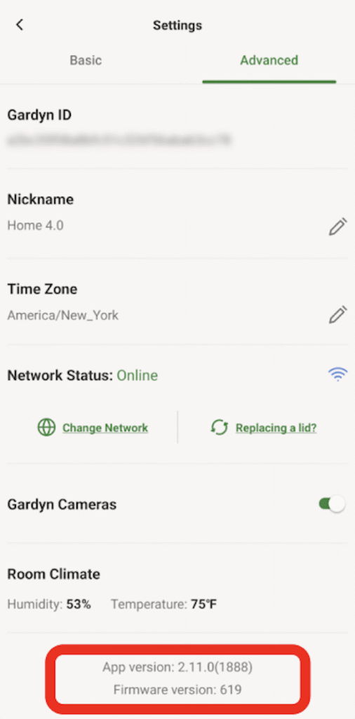 You can check the Firmware version of your Gardyn in your Gardyn App in Settings -> Advanced. The version should be 619 or later.