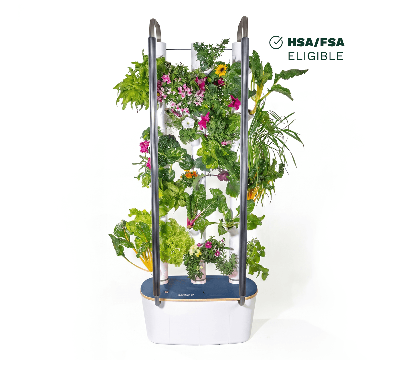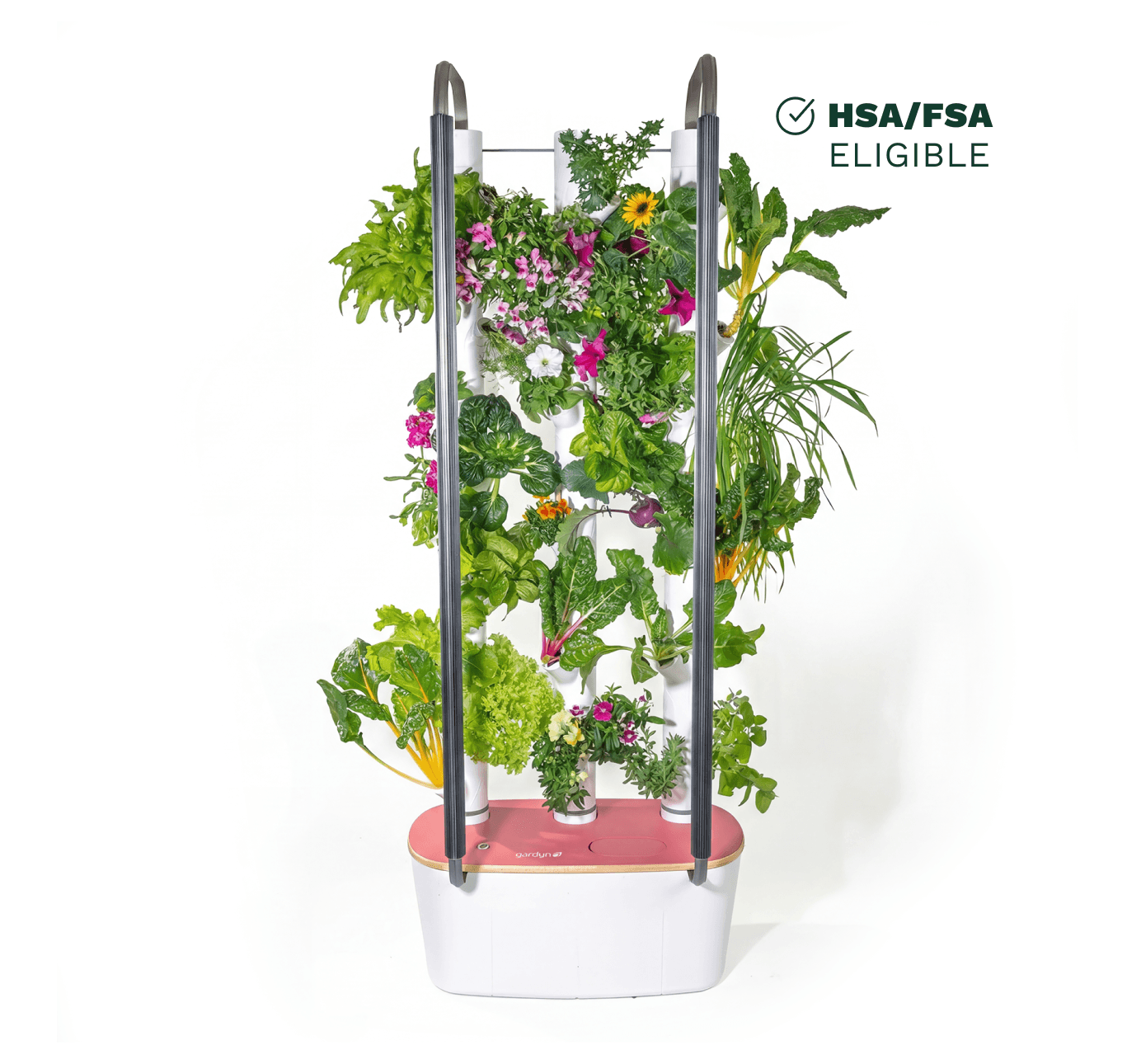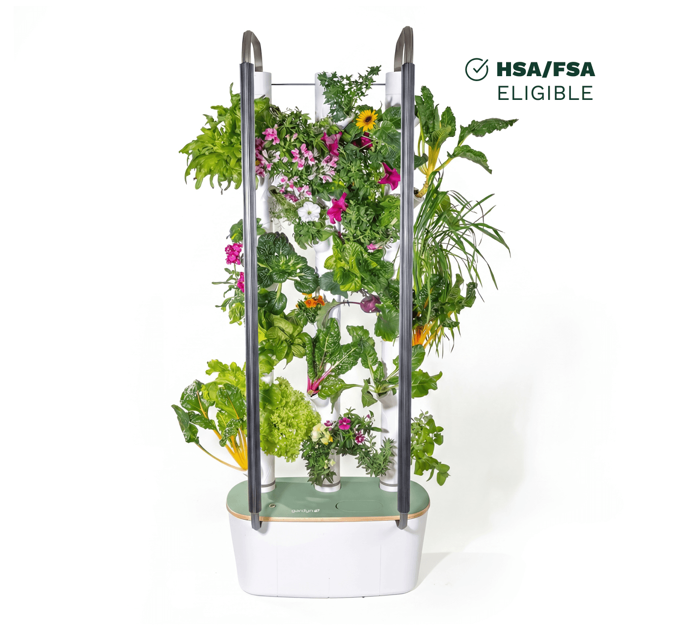 Close-up of Gardyn Home 4.0 white growing columns with vibrant herbs and leafy greens